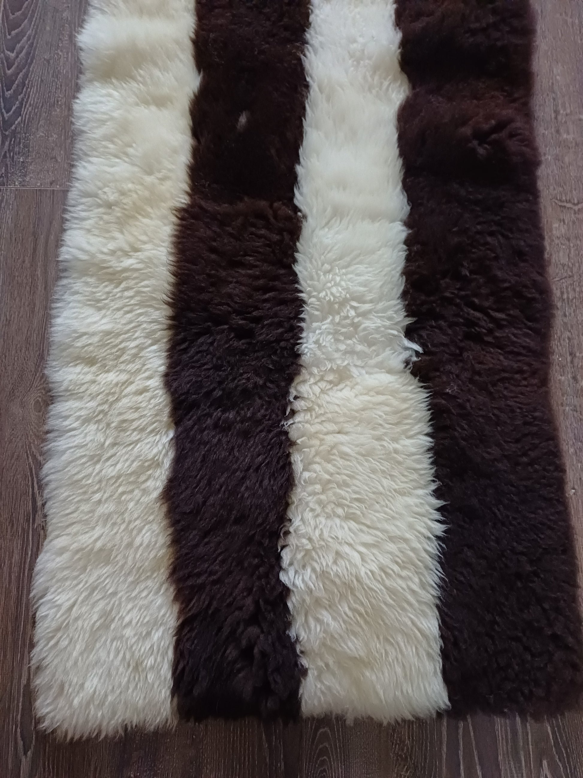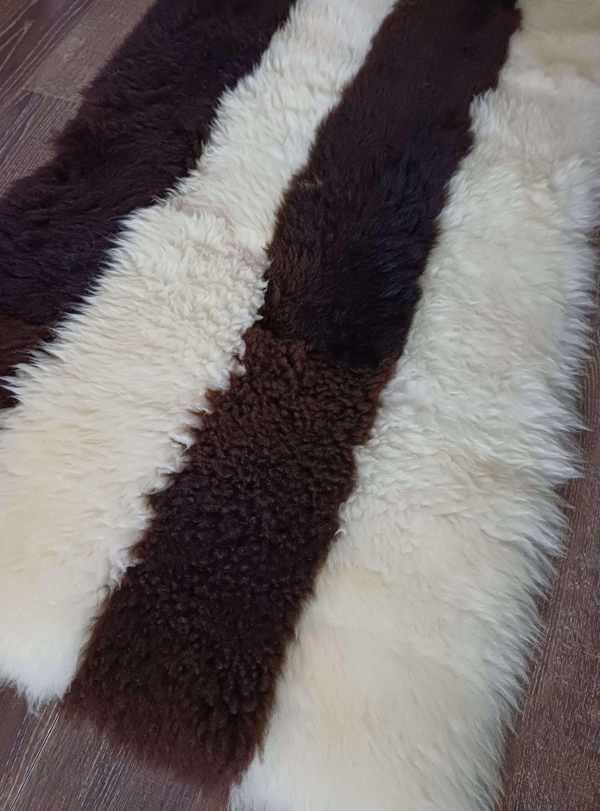 Dit prachtige kleed is handgemaakt van diverse stukken schapenvacht. Meestal worden compacte kort geschoren vachten gebruikt waardoor de kleden vaak een comfortabele dikte hebben. De lengtes kunnen per kleed en per vakje verschillen.