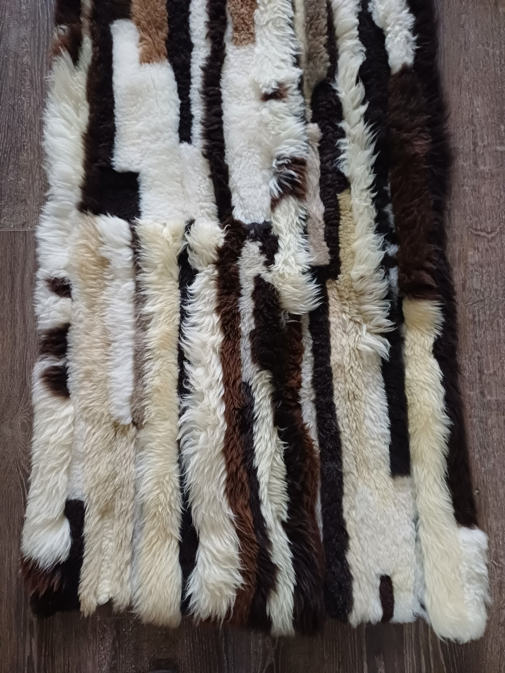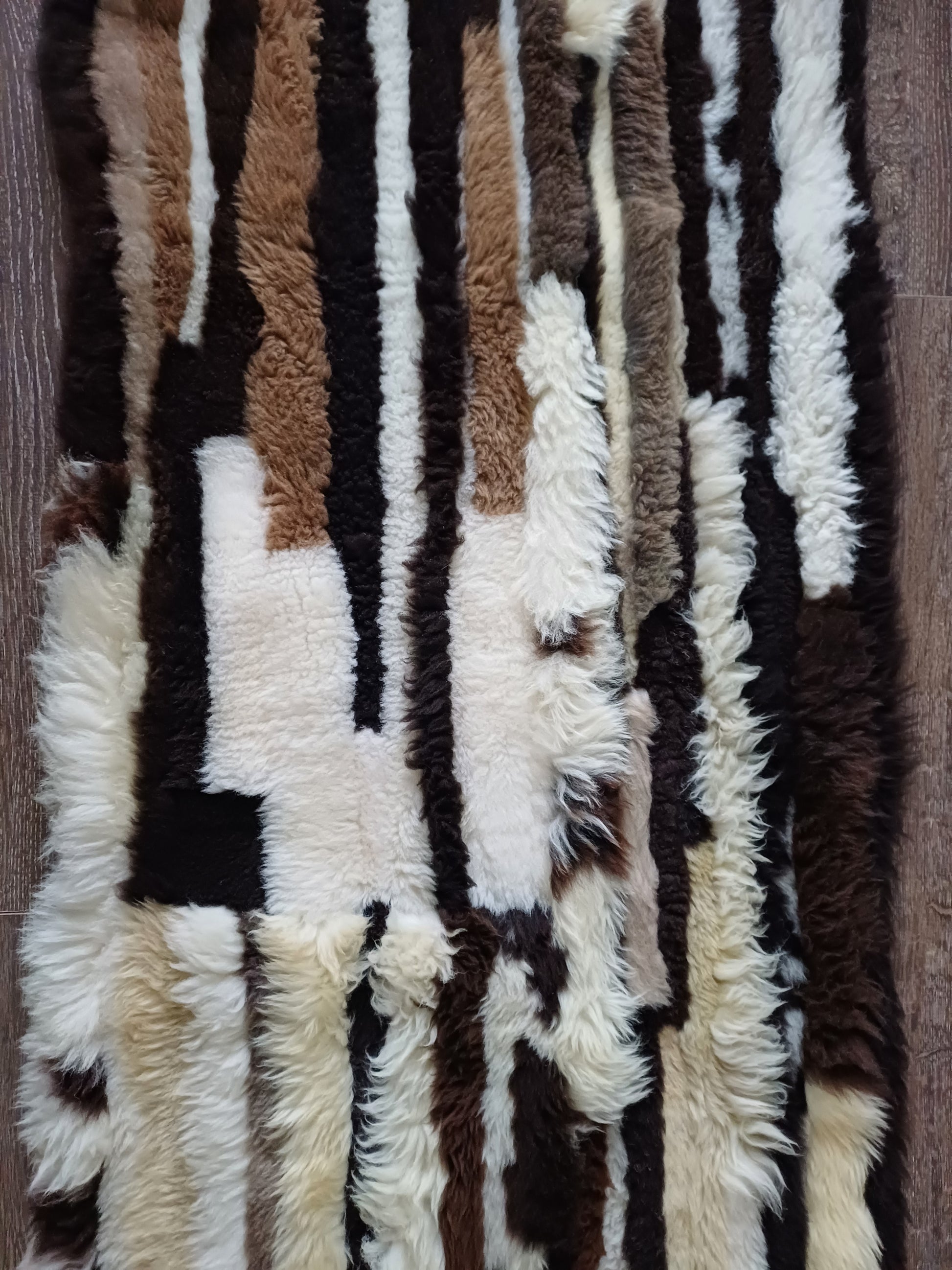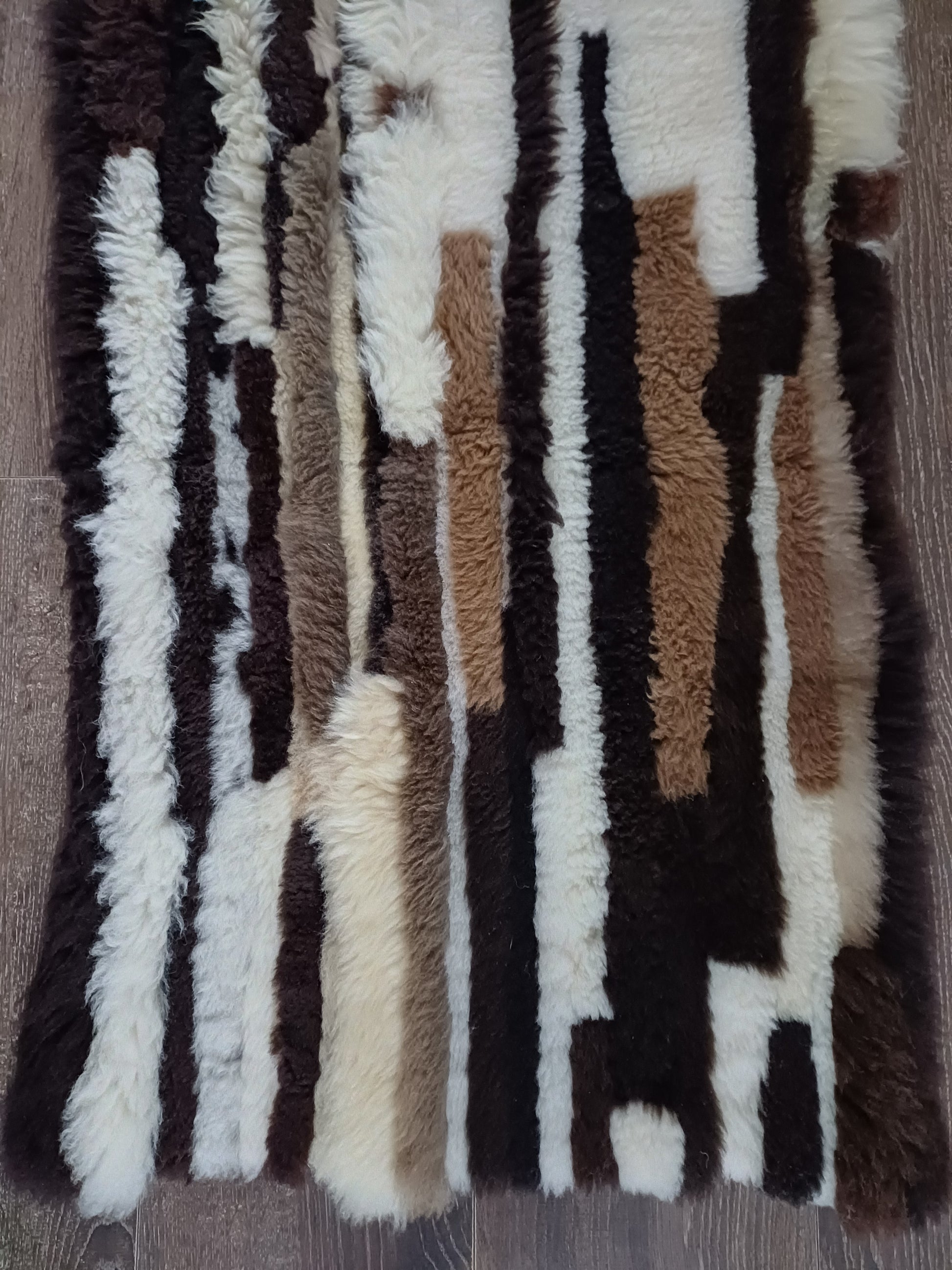 Dit prachtige kleed is handgemaakt van diverse stukken schapenvacht. Meestal worden compacte kort geschoren vachten gebruikt waardoor de kleden vaak een comfortabele dikte hebben. De lengtes kunnen per kleed en per vakje verschillen.