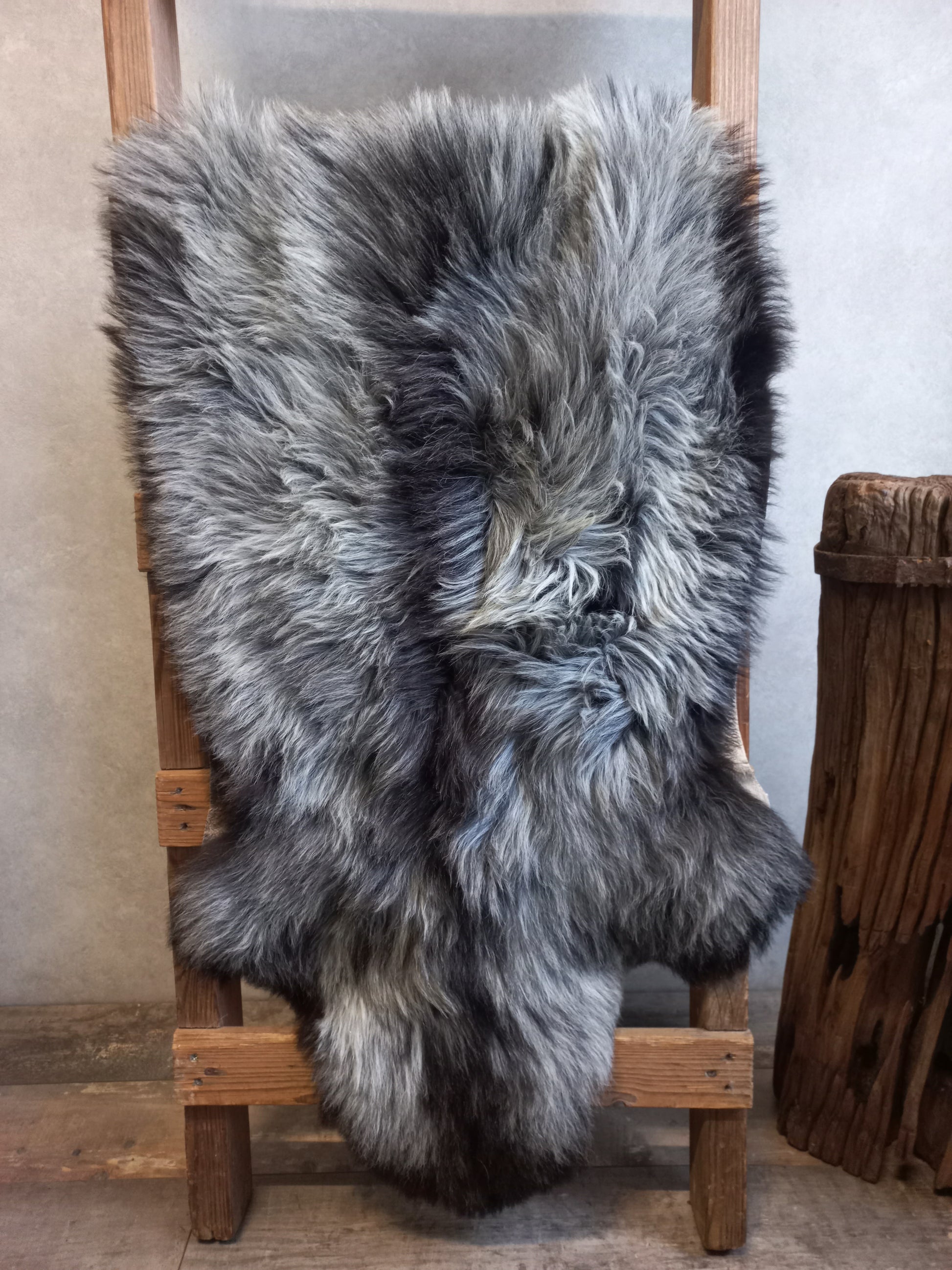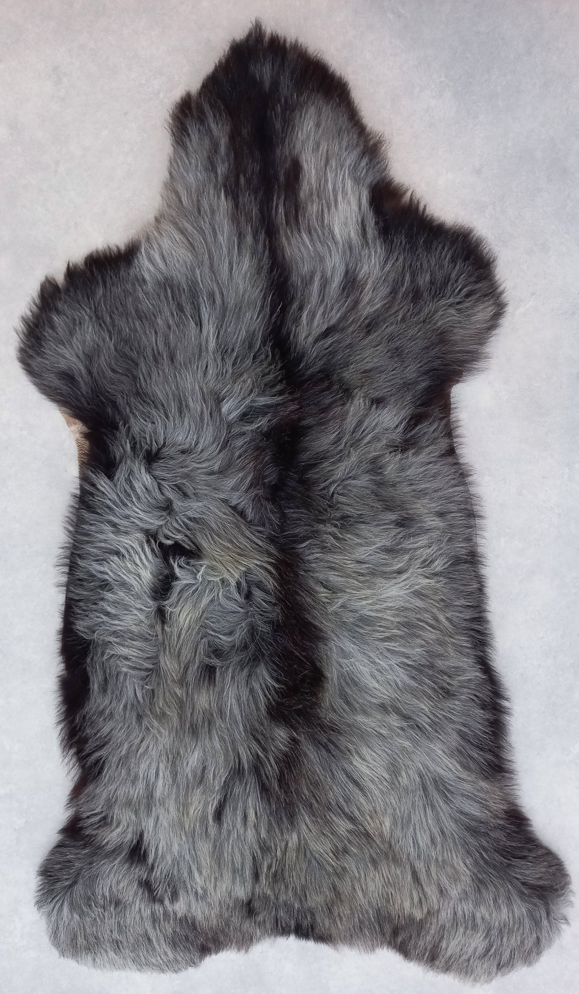 Prachtige decoratieve vacht van een Heidschnucke schaap in hele mooie grijstinten. Het Heidschnucke schaap is een schapenras uit het Noorden van Duitsland. Heidschnucke vachten zijn er in diverse kleuren. Ze zijn een beetje ruig en hebben een geheel eigen "touch".