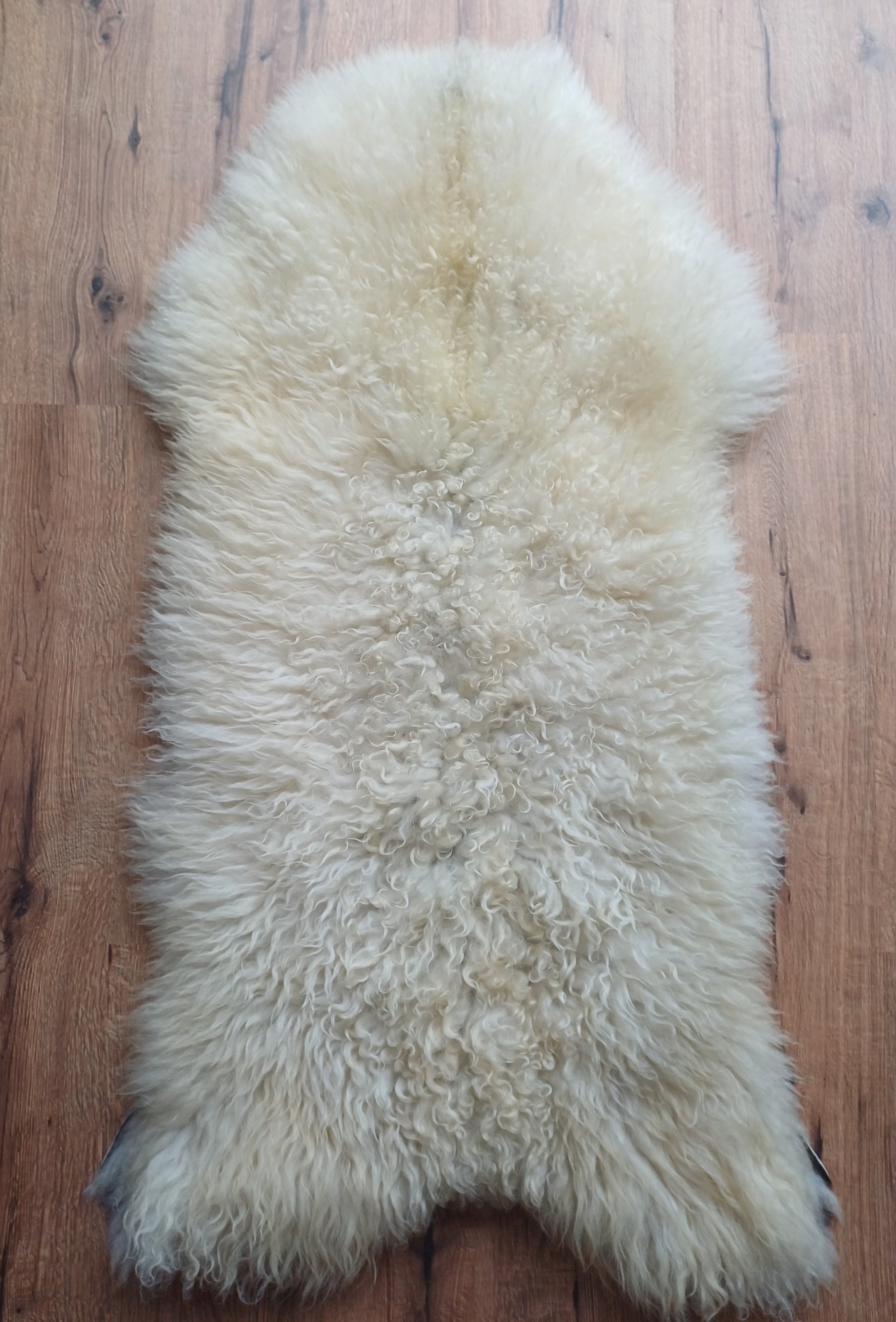 Lekkere zachte melerade vacht met mooie blonde krullen.