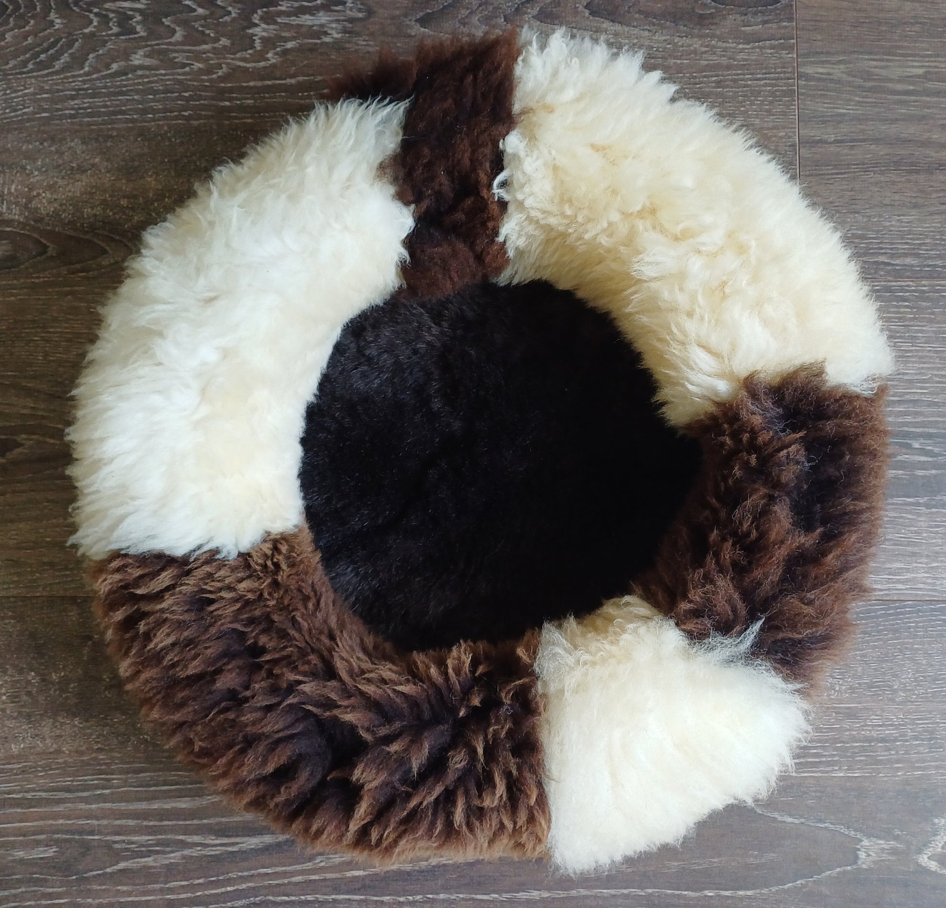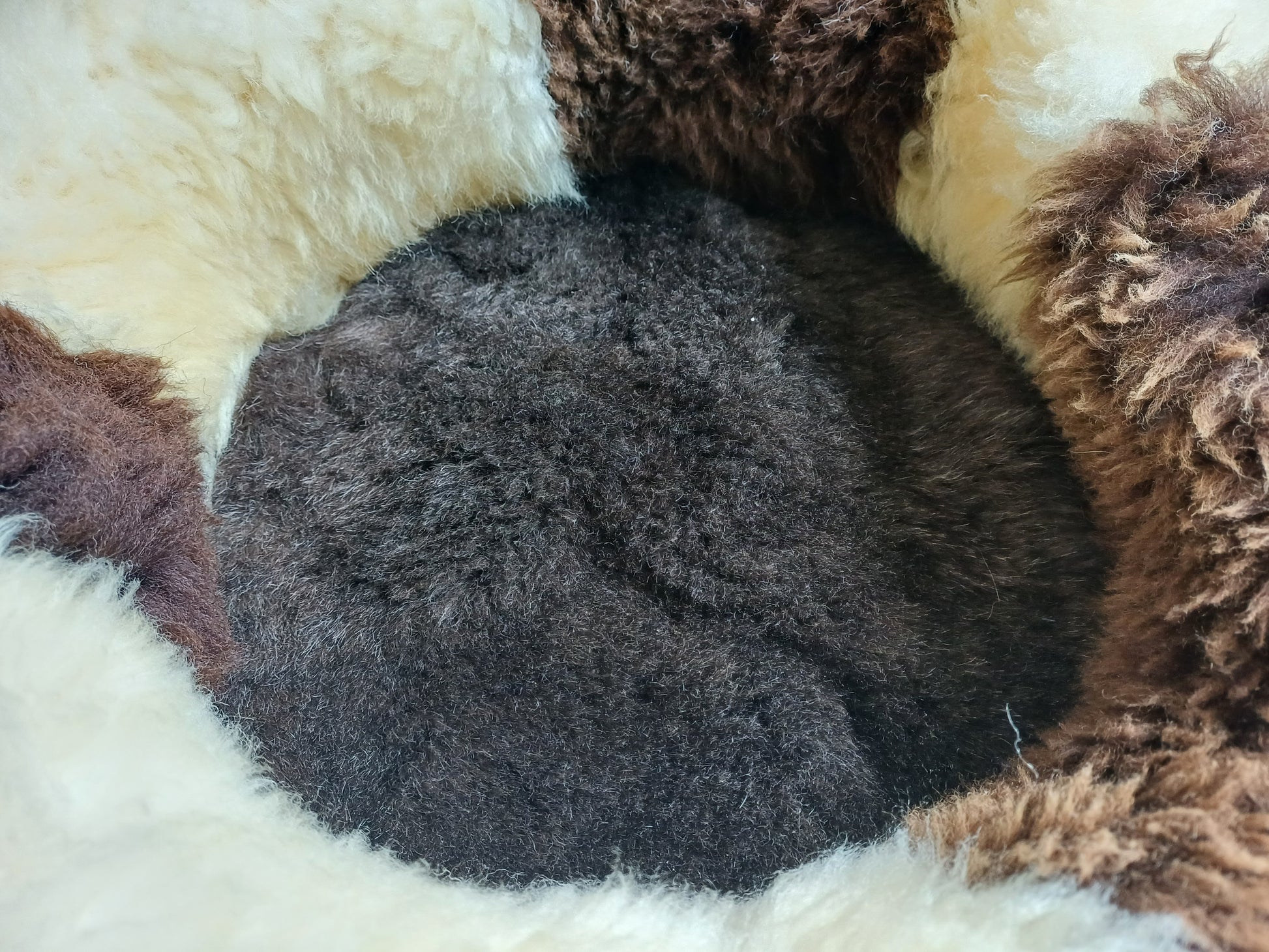 Prachtige mand gemaakt van 100% ecologisch gelooide stukken schapenvacht. Het gebruik van verschillende kleuren en vachten van verschillende schapenrassen zorgen ervoor dat elke mand uniek is. U en uw huisdier genieten van alle voordelen die een schapenvacht biedt maar dan in de vorm van een mand. Dubbel zo knus dus.