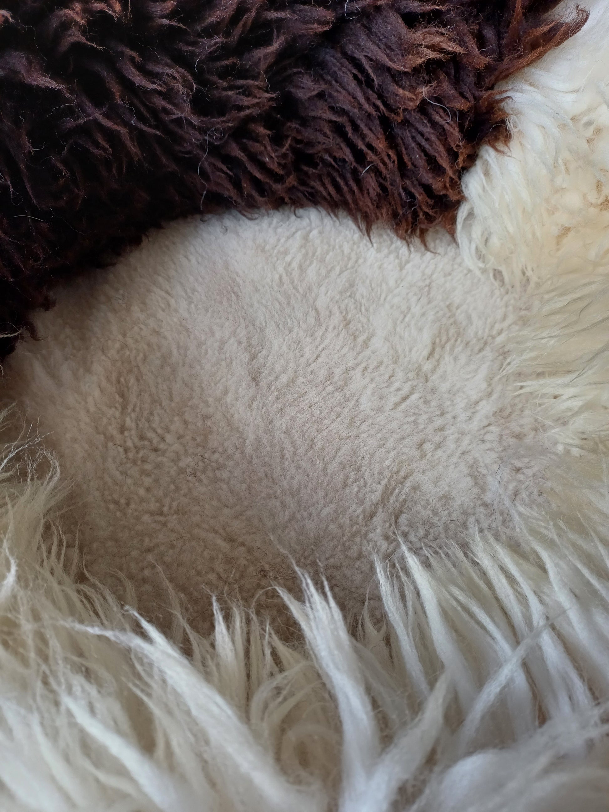 Prachtige mand gemaakt van 100% ecologisch gelooide stukken schapenvacht. Het gebruik van verschillende kleuren en vachten van verschillende schapenrassen zorgen ervoor dat  elke mand uniek is. U en uw huisdier genieten van alle voordelen die een schapenvacht biedt maar dan in de vorm van een mand. Dubbel zo knus dus.