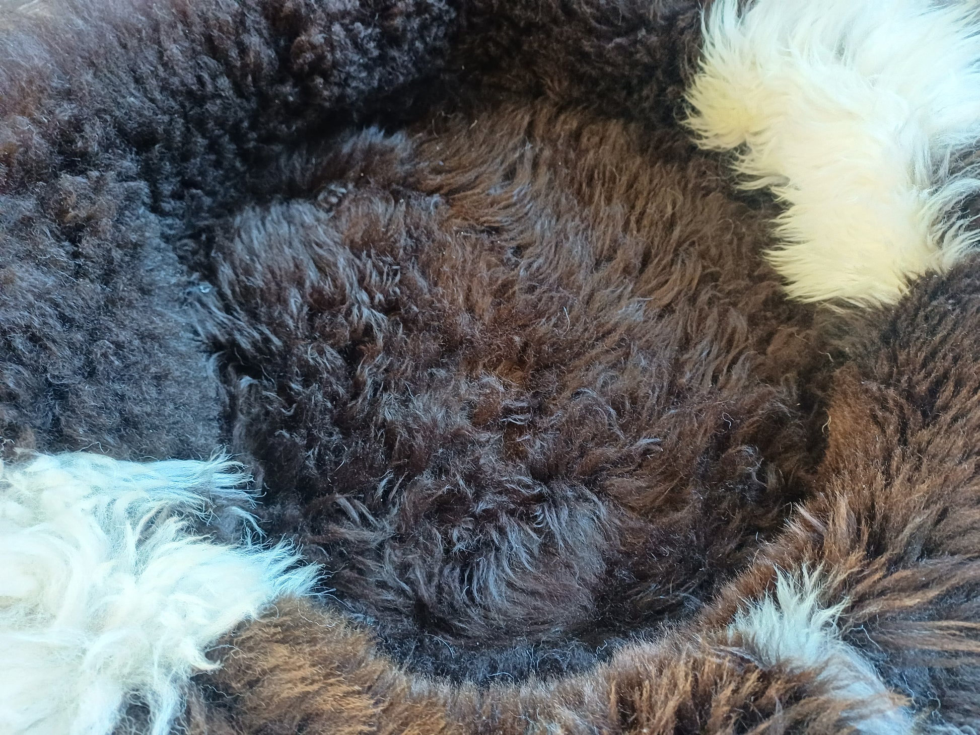 Prachtige mand gemaakt van 100% ecologisch gelooide stukken schapenvacht. Het gebruik van verschillende kleuren en vachten van verschillende schapenrassen zorgen ervoor dat elke mand uniek is. U en uw huisdier genieten van alle voordelen die een schapenvacht biedt maar dan in de vorm van een mand. Dubbel zo knus dus.