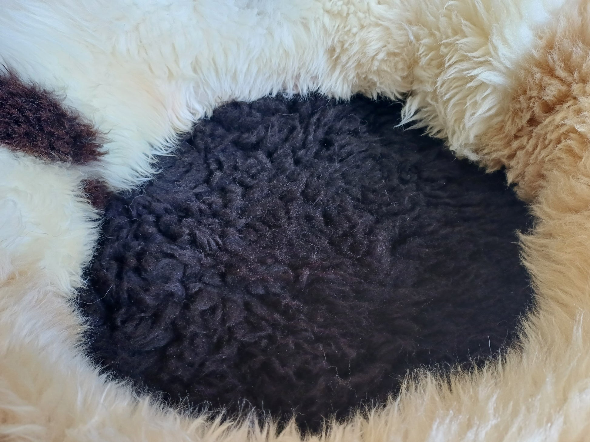 Prachtige mand gemaakt van 100% ecologisch gelooide stukken schapenvacht. Het gebruik van verschillende kleuren en vachten van verschillende schapenrassen zorgen ervoor dat elke mand uniek is. U en uw huisdier genieten van alle voordelen die een schapenvacht biedt maar dan in de vorm van een mand. Dubbel zo knus dus.