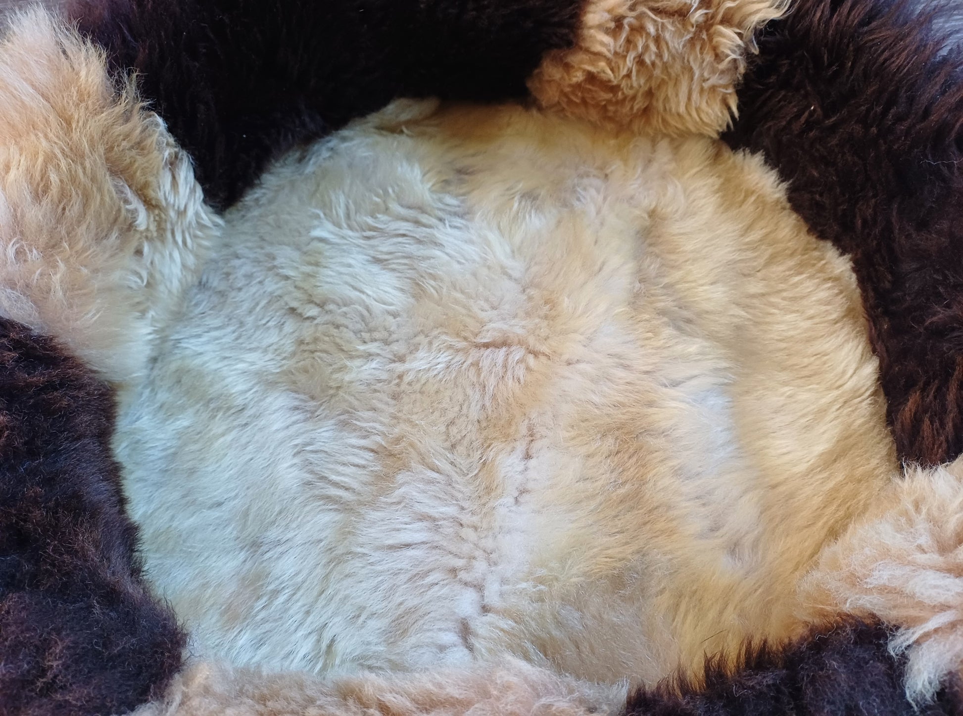 Prachtige mand gemaakt van 100% ecologisch gelooide stukken schapenvacht. Het gebruik van verschillende kleuren en vachten van verschillende schapenrassen zorgen ervoor dat  elke mand uniek is. U en uw huisdier genieten van alle voordelen die een schapenvacht biedt maar dan in de vorm van een mand. Dubbel zo knus dus.