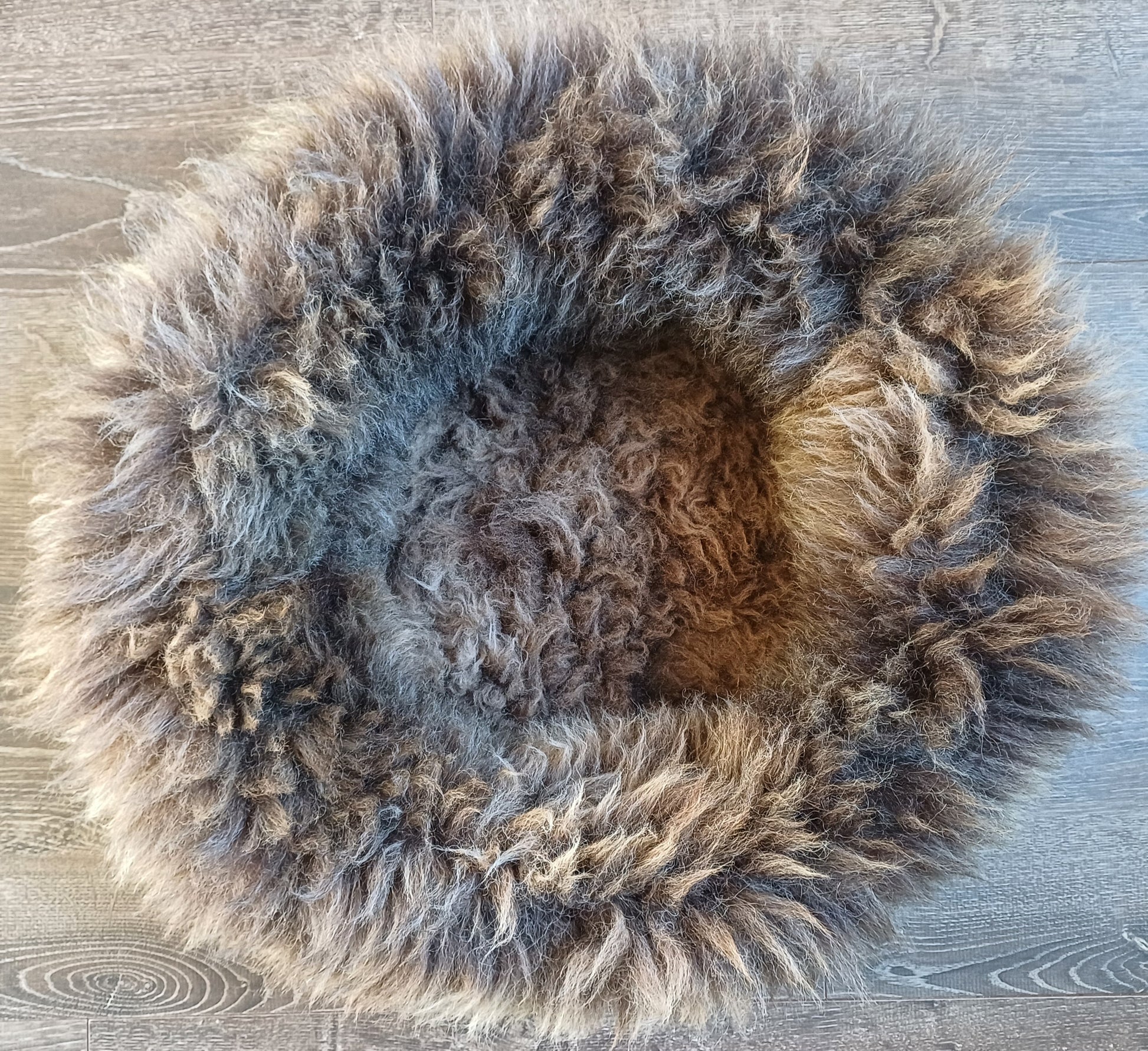 Prachtige mand gemaakt van 100% ecologisch gelooide stukken schapenvacht. Het gebruik van verschillende kleuren en vachten van verschillende schapenrassen zorgen ervoor dat elke mand uniek is. U en uw huisdier genieten van alle voordelen die een schapenvacht biedt maar dan in de vorm van een mand. Dubbel zo knus dus.
