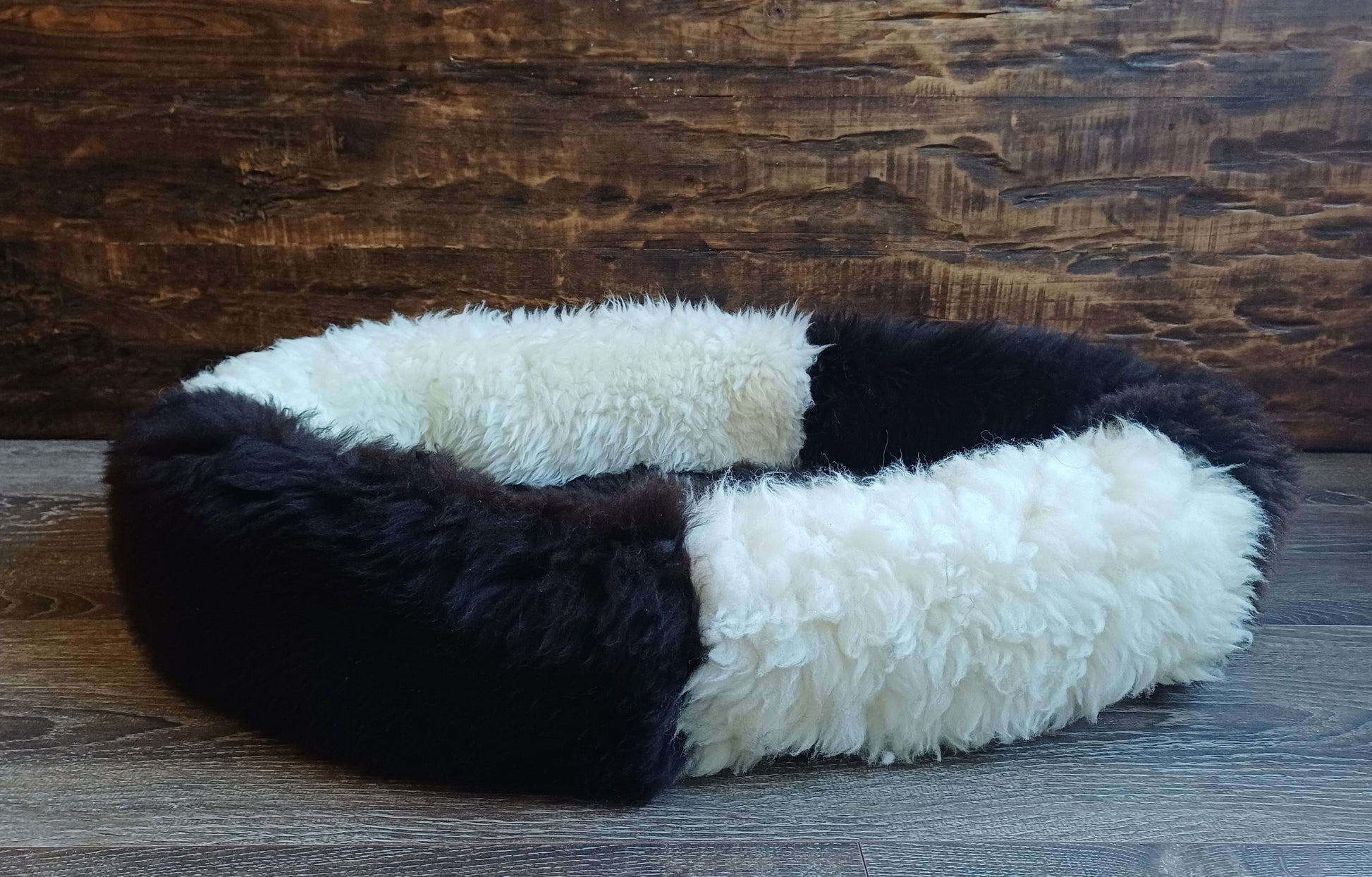 Mand gemaakt van 100% ecologisch gelooide stukken schapenvacht. Het gebruik van verschillende kleuren en vachten van verschillende schapenrassen zorgt ervoor dat elke mand uniek is. U en uw huisdier genieten van alle voordelen die een schapenvacht biedt, maar dan in de vorm van een mand.
