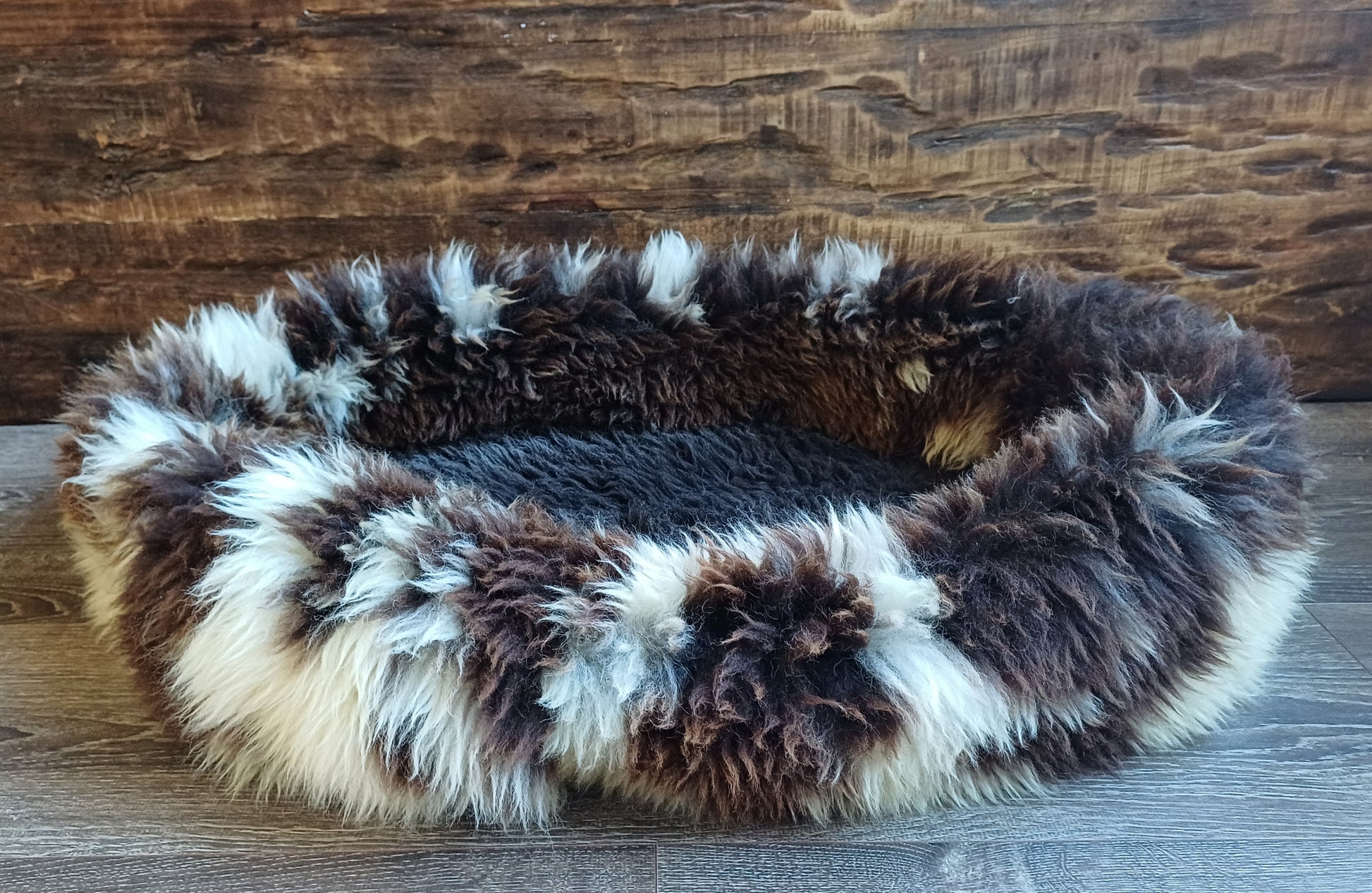 Mand gemaakt van 100% ecologisch gelooide stukken schapenvacht. Het gebruik van verschillende kleuren en vachten van verschillende schapenrassen zorgt ervoor dat elke mand uniek is. U en uw huisdier genieten van alle voordelen die een schapenvacht biedt, maar dan in de vorm van een mand.