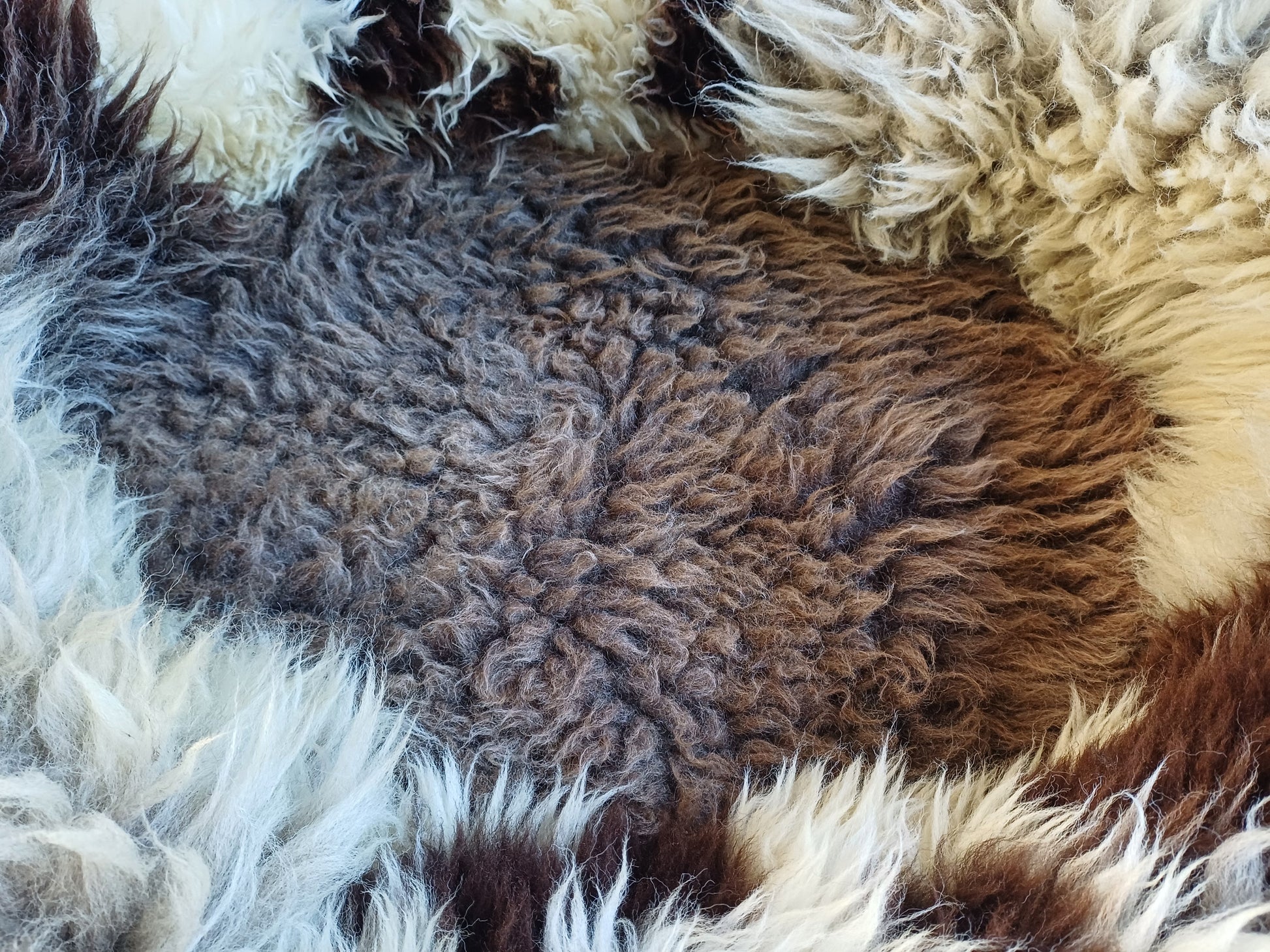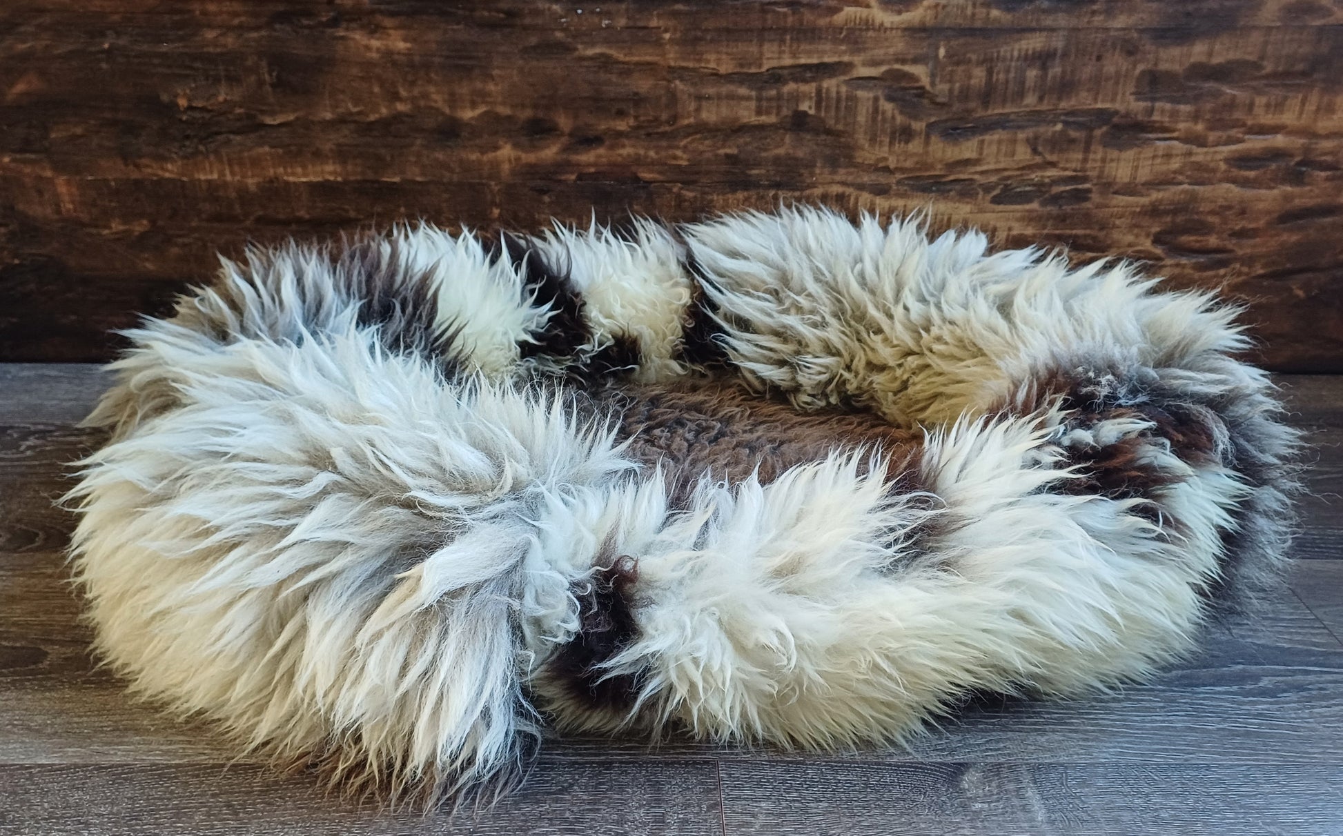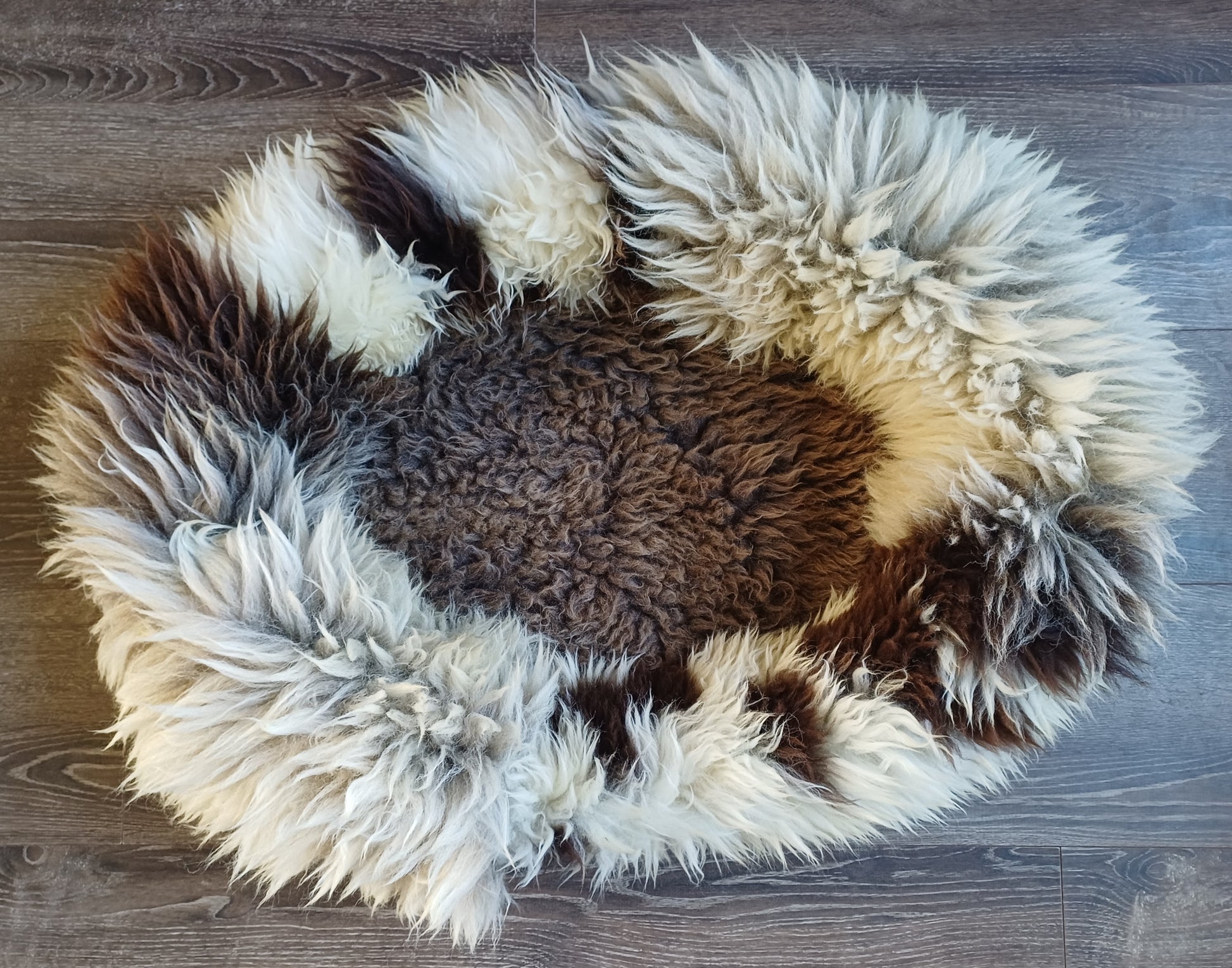 Mand gemaakt van 100% ecologisch gelooide stukken schapenvacht. Het gebruik van verschillende kleuren en vachten van verschillende schapenrassen zorgt ervoor dat  elke mand uniek is. U en uw huisdier genieten van alle voordelen die een schapenvacht biedt, maar dan in de vorm van een mand.