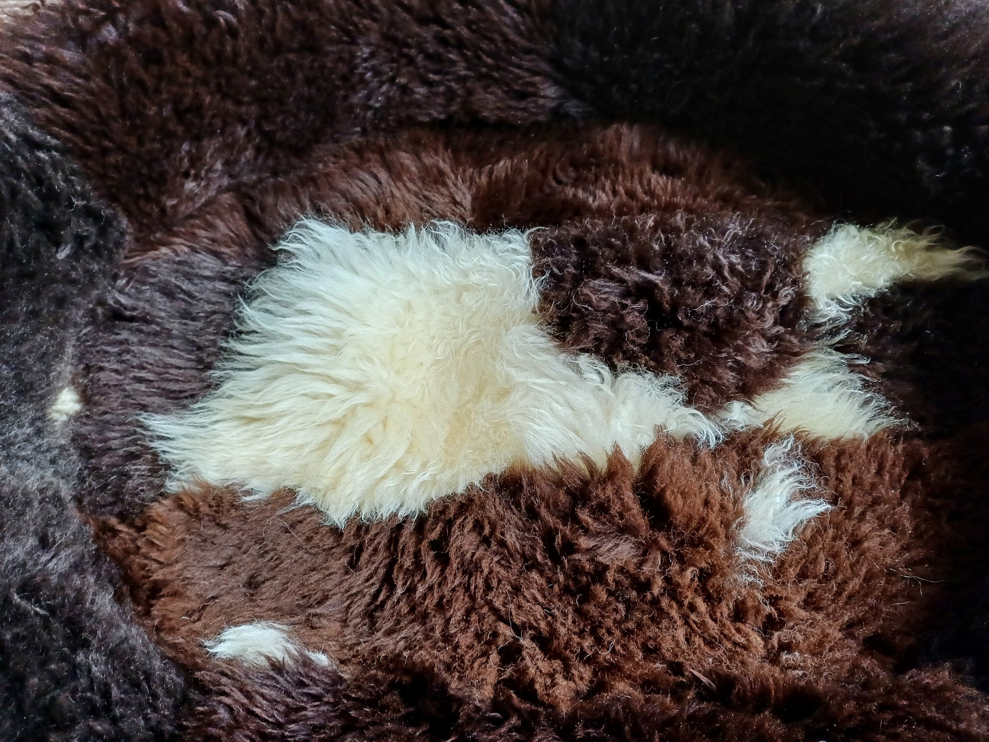 Mand gemaakt van 100% ecologisch gelooide stukken schapenvacht. Het gebruik van verschillende kleuren en vachten van verschillende schapenrassen zorgt ervoor dat elke mand uniek is. U en uw huisdier genieten van alle voordelen die een schapenvacht biedt, maar dan in de vorm van een mand.